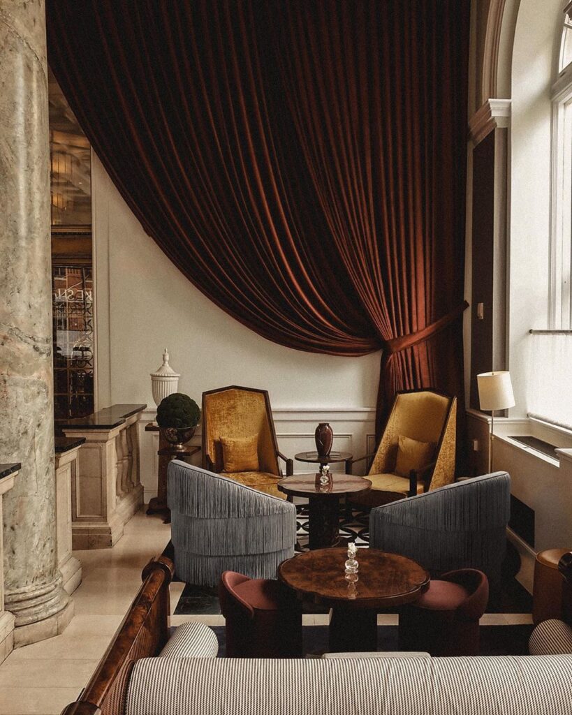 If you’re looking for your Great Gatsby moment, now’s the time. AND I AM IN LOVE! Art Deco is back, baby, with all its glamour, luxury, and bold styling. Ya know, it IS the “NEW Roaring ’20s!” Think glossy lacquer, marble, mirrors, brass, gold, and chrome, and geometric detailing like chevrons and sunbursts EVERYWHERE! SUPER moody jewel tone color palettes are perfect for that Art Deco vibe. (psssst..two of the photos below are from a boutique hotel I stayed in whilst in Vienna, Austria last year!)